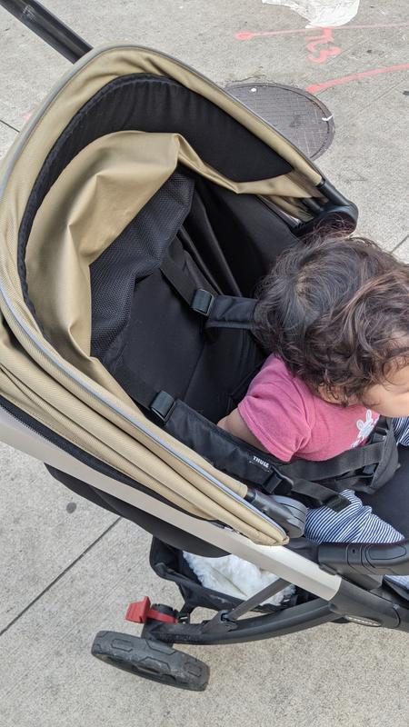 We LOVE this stroller so much. With city apartment living, space is extremely limited, and this was one of the reasons we went for the Thule Spring. The jogger-style wheels make for an extremely smooth ride, we were both pleasantly surprised with how well this stroller handled! The canopy is UPF protected and comes down super low for naps, but we can still check in on the babe with the mesh panel at the back. Also, for those with toddlers, the sides of the stroller are DEEP, so this means that little hands can't spread wide and get caught on doorframes, etc. Our only caveat is that we wish the basket was bigger as you can't hang the diaper bag in the back if the seat is fully reclined. But otherwise, an amazing stroller design!