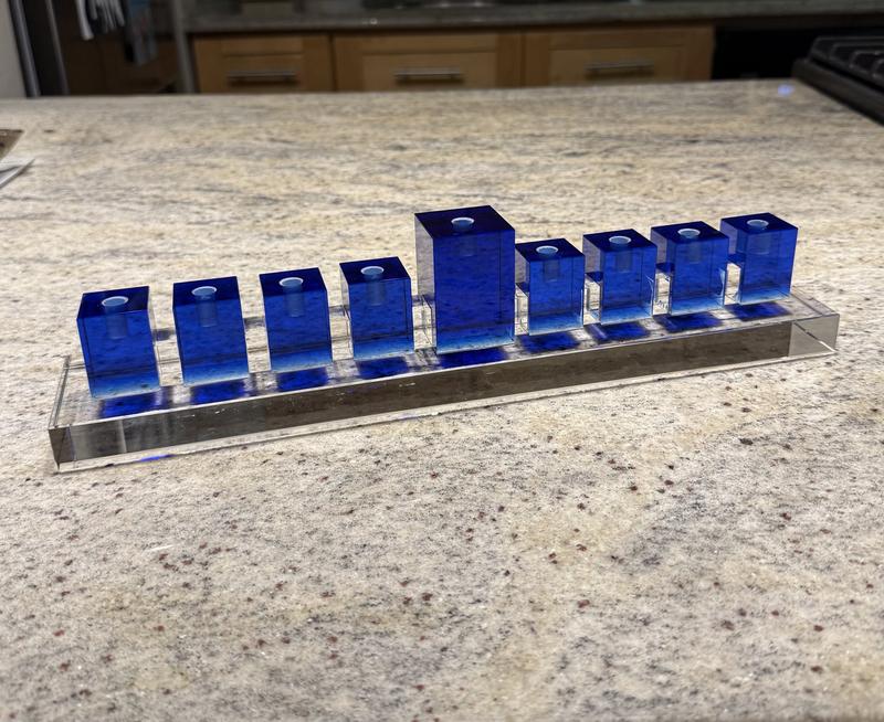 Beautiful azure menorah, simple, modern and substantial without being ostentatious.