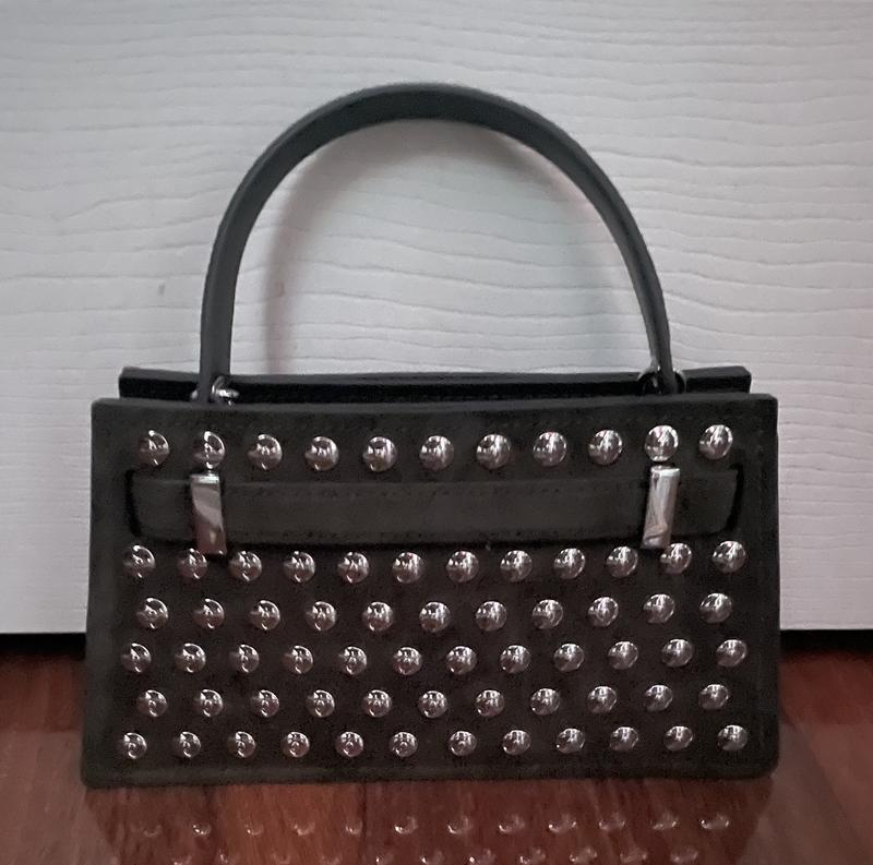 This dark olive green suede studded bag is gorgeous and very versatile. The bag can dressed up or down with ease. I love that the bag is fully studded. The silver hardware is very sturdy. This bag has several interior compartments, including 3 credit card slots. It fits my regular size iPhone 15, a standard card case and keys.