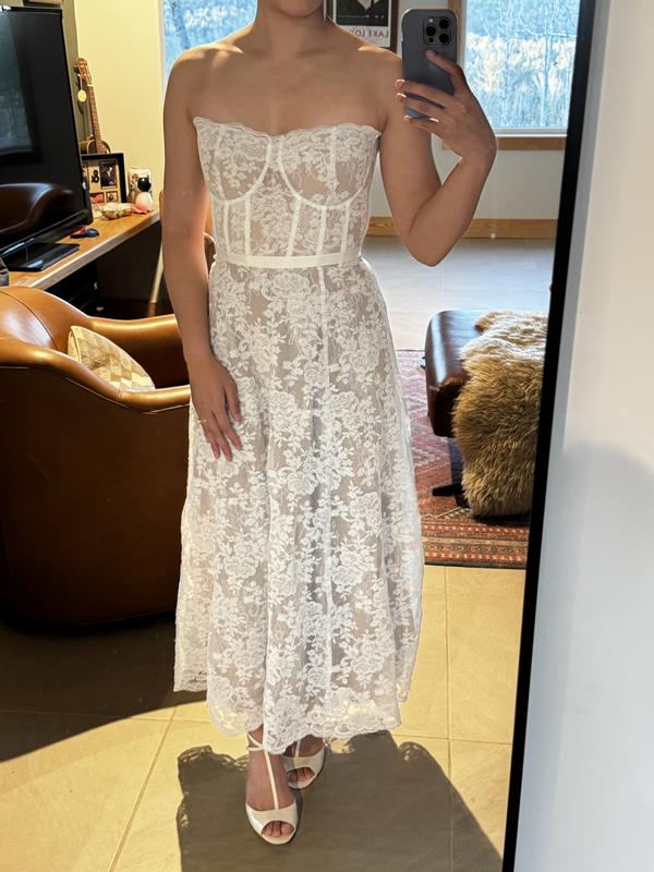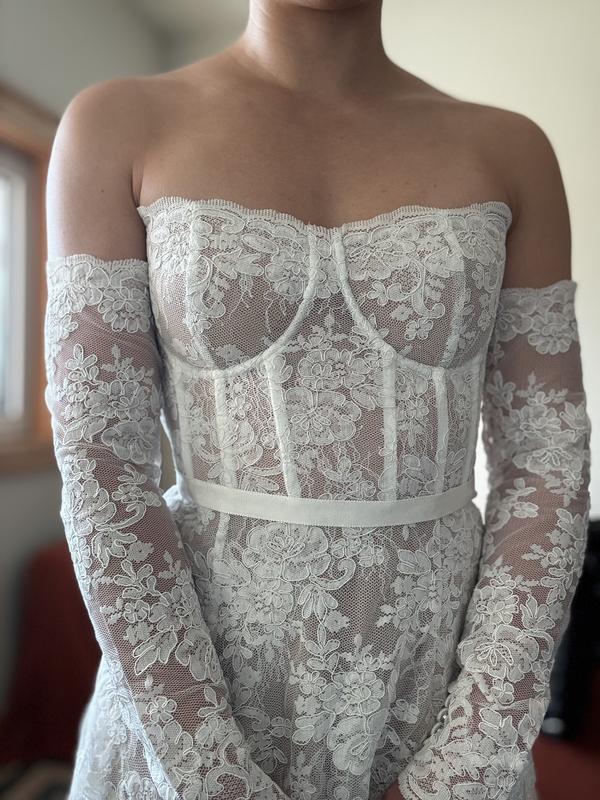 This dress is beautiful. The lace corset back ensures a perfect fit. The quality is great and I loved that the detachable sleeves allowed for multiple looks. I ended up returning the dress because it was too long on me (I’m 5’2”) and didn’t want to get it altered. However, if it was otherwise gorgeous and perfect for a bridal event or even an elopement or courthouse wedding.