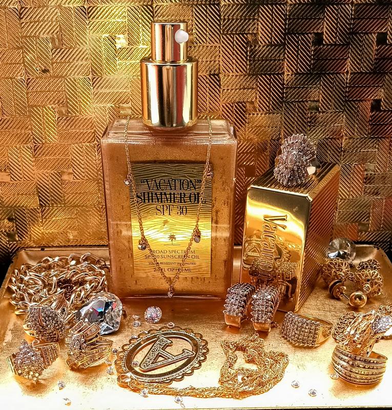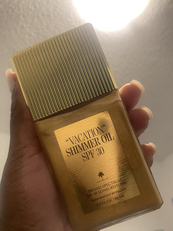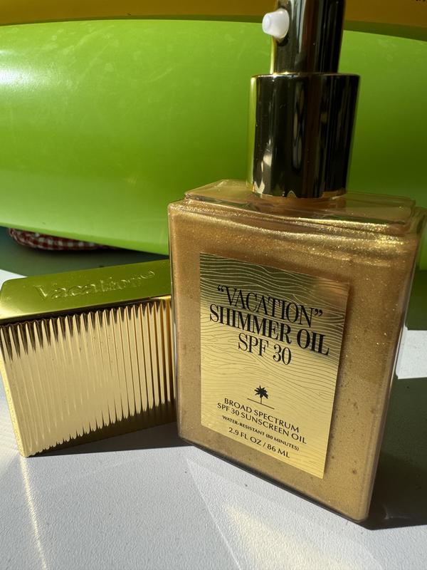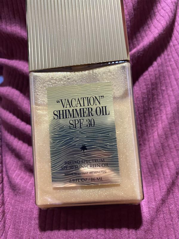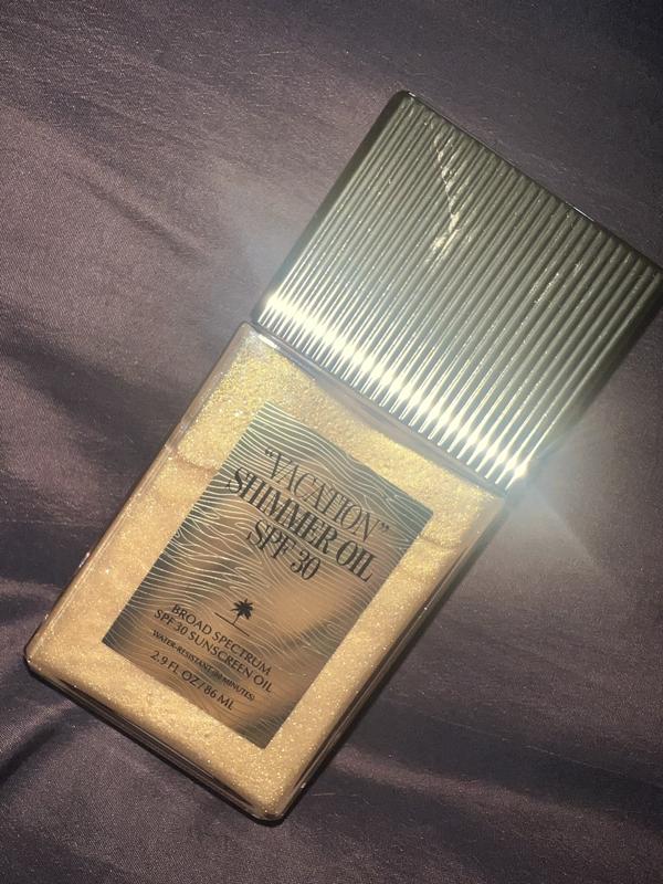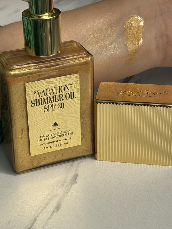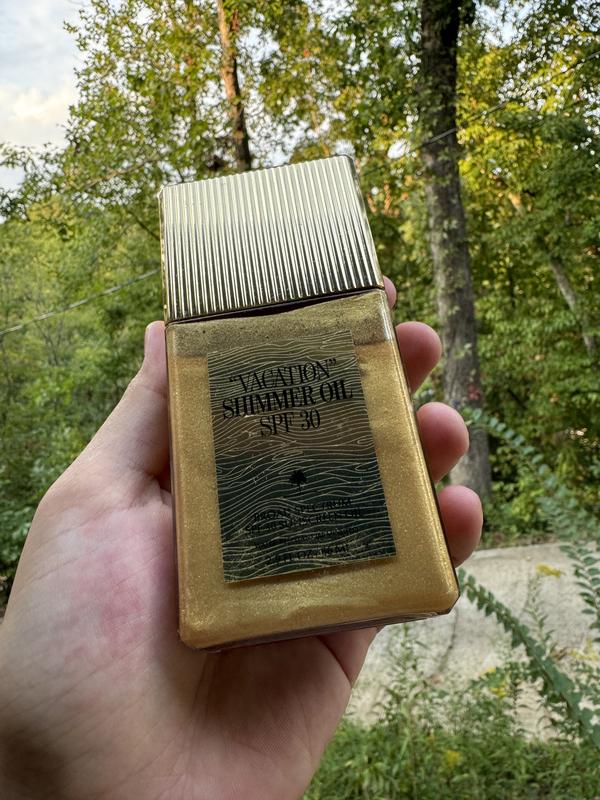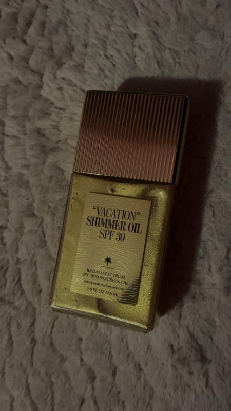 Wonderful protection, wonderful shimmer, beautiful glow, can’t feel it when it’s on, flattering bit of color, it’s just great. I use two pumps on both arms then wipe any excess off on my legs. Any shimmer left on my hands I wipe on my clothes for a little more sparkle. I highly recommend!! This is like the Vacation hidden pearl product. AND beautiful packaging