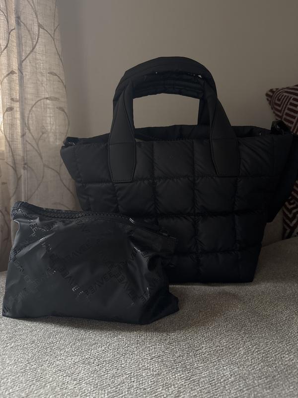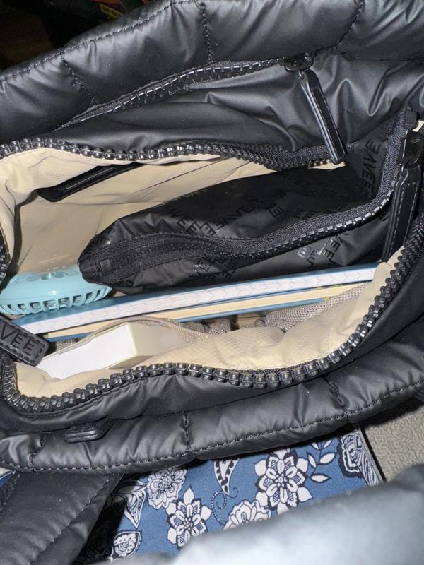 Glad I chose the small. Able to fit my kindle, iPad, a book, bottle of water, and wallet. Also love that it comes with a make up bag to throw toiletries in.
