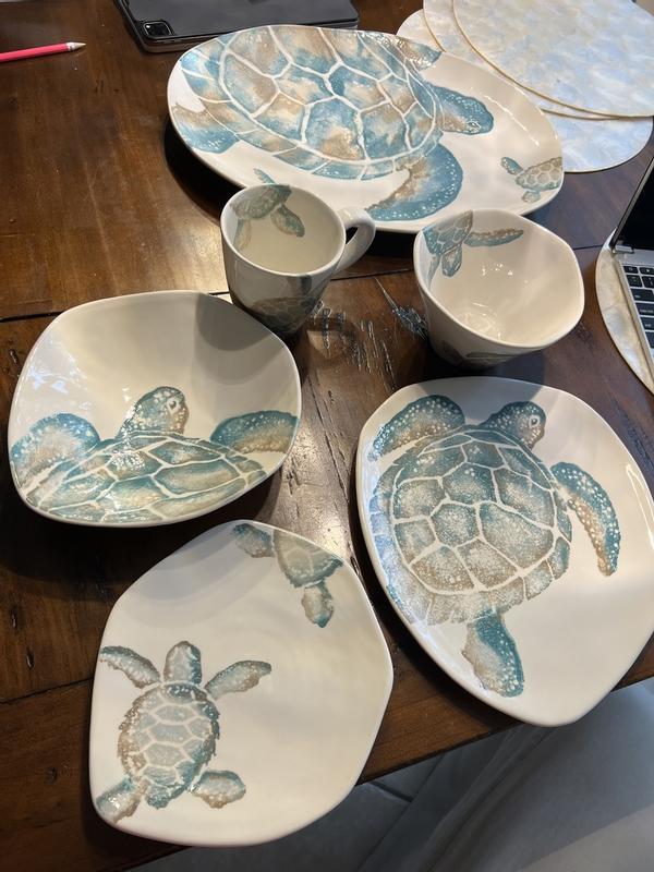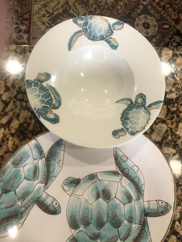 Love the turtle design. the pattern and colors are spot on. The shape is comfortable to hold and the size works well with my morning coffee. I look forward to having more pieces in this pattern.