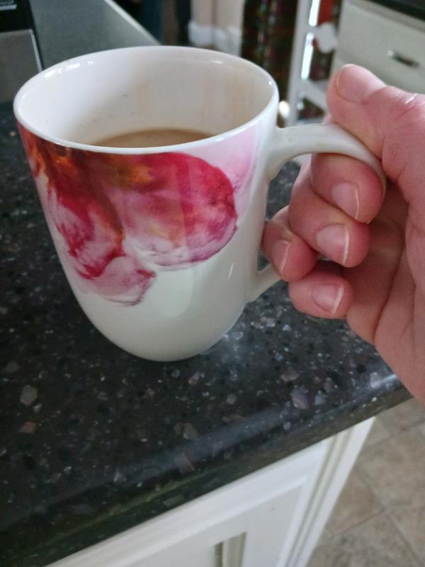 I've had this mug for over a month and it has become my go-to daily coffee mug. I love the size, the weight, and the ease of cupping my hands around it. I don't give 5 stars just because the design is a little strange. My daughter thought something pink spilled over my mug. Overall, excellent mug but other design options would be great for me.