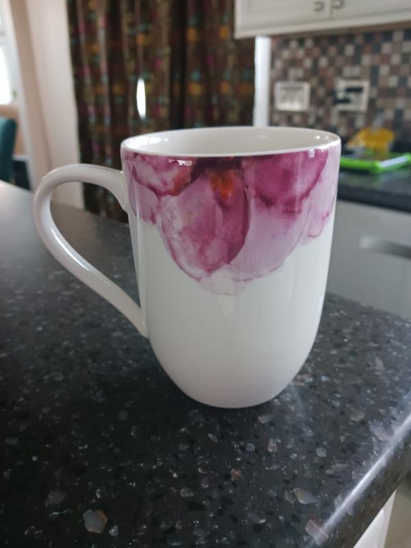 this mug is very beautiful, simple, and classy. The mug is on the smaller side, but it fits perfectly in my hands. I like how the white color mix in with the different hues of pink/purple. This is a very girly mug and I love that.