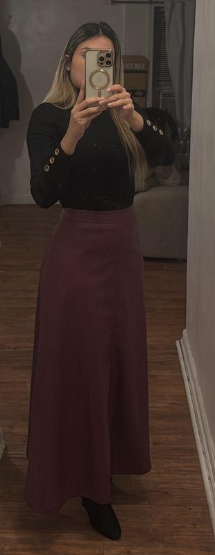 This skirt in burgundy is absolutely stunning and looks way more expensive than the price. The quality of the fabric the richness of the color makes this skirt a must buy piece. Having said that, unfortunately I need to return it and hope they have a size XS left. I am a size 4 small and this runs more like a 6.