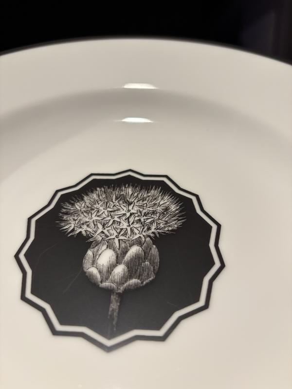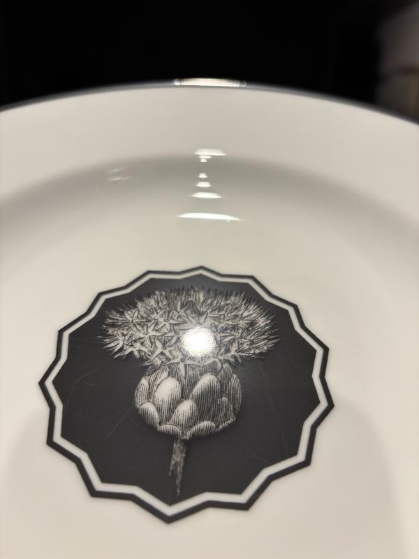 These are quite nice out of the box. A bit lighter when compared to the dessert plates which are similar diameter. Beautiful gold hallmark on the back. Unfortunately (despite claims of scratch resistance from the manufacturer), the central black medallion shows scratches after first use. I was expecting to be able to use a spoon with these without immediately damaging the finish.