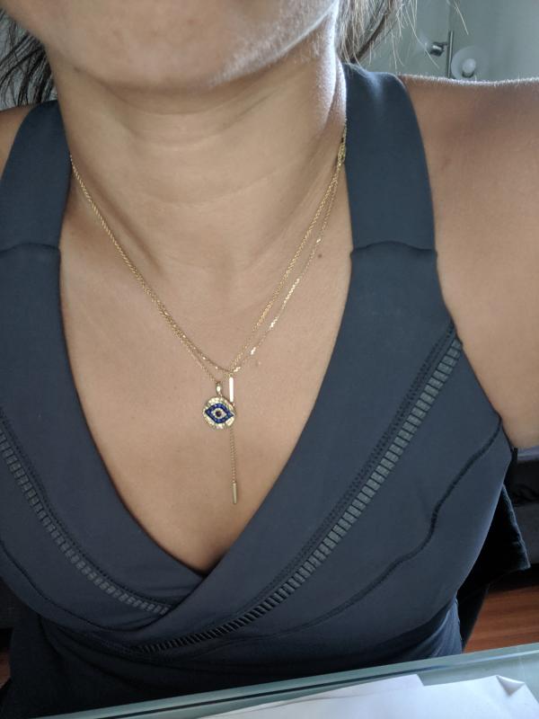 Nice necklace. I narrowed down my choice from about five evil eye necklaces. This one won because it is unique & a quality piece. The chain was tangled (as mentioned in other reviews) but with some patience, I got it straightened out. For this price point, I'd think Bloomingdale's could send a piece with the chain untangled & pack the chain in a tiny plastic bag to keep it that way. I think this item is almost sold out but I would recommend it if still available. It really is beautiful.