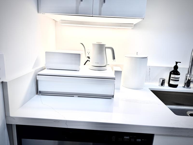 I have a tiny kitchen with only one drawer, which makes storing all the bits and bobs a huge pain. But no longer! Now my hot water heater for tea has a stylish perch and all my things are tucked out of sight in a drawer.