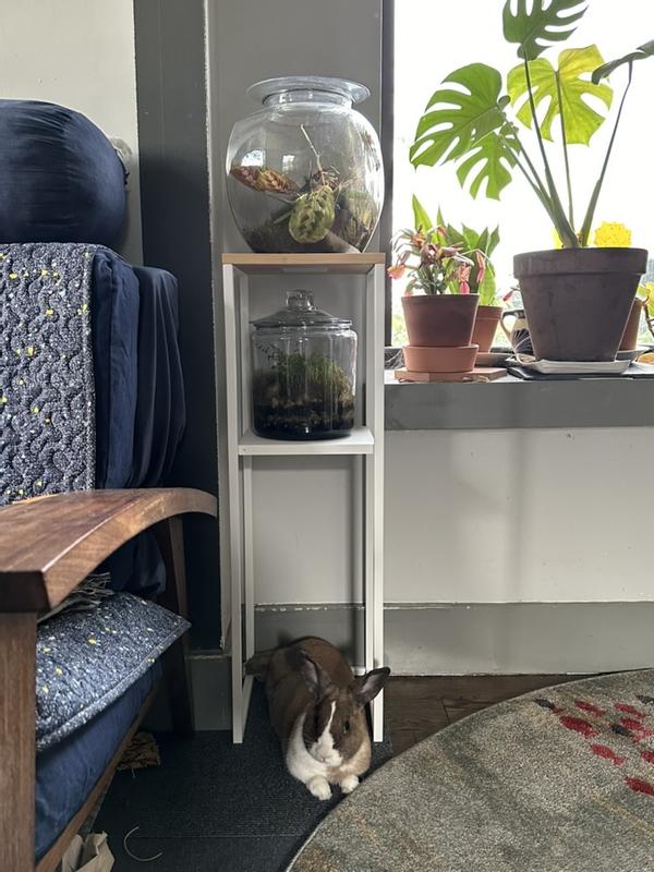 This shelf arrived in a very compact box with minimal packaging. It was easy to assemble and is now a perfect place to hold my two terrariums. It makes our space look a little less cluttered and a bit more put-together.