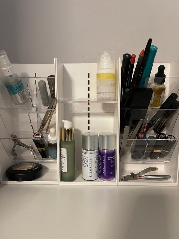 I am truly amazed by the excellence of this makeup organizer. The elegant white color enhances its chic and aesthetically pleasing appeal. It is skillfully crafted, durable, and sturdy, showcasing excellent quality. The organizer features adjustable shelving, making it versatile and convenient. It is perfectly sized for all your makeup needs. The organizer comes pre-assembled and includes user-friendly instructions for easy setup. I highly recommend this make up organizer because of his price and quality.