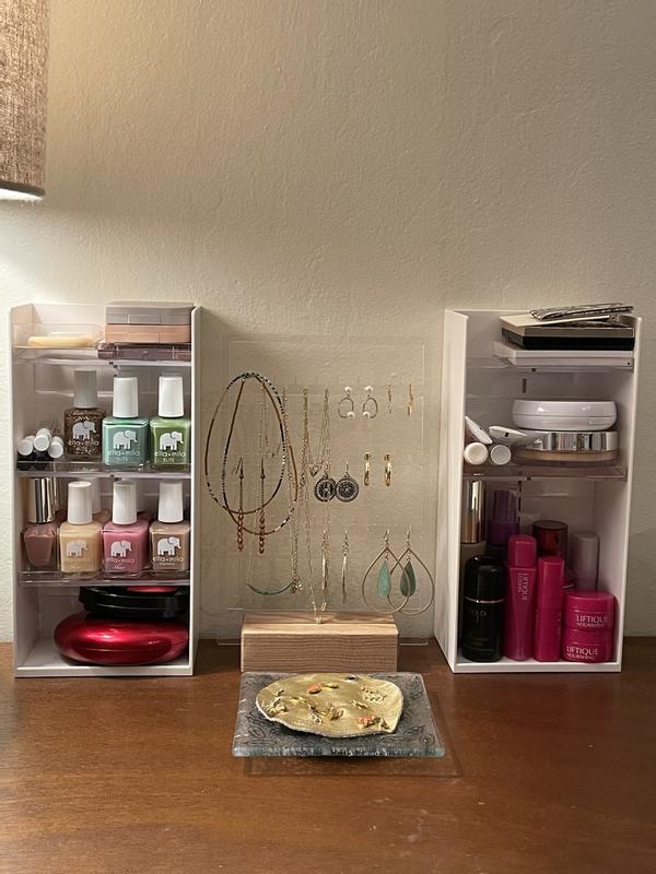 My Go-To for organizers in our home is Yamazaki. I love their thoughtful designs, clean lines and pricing. I purchased 2 styles of the makeup organizers. One with angled shelves, the other with flat shelves. I am so glad that I bought 2 of each! All of my makeup essentials fit and my makeup desk is now clutter free and easy to see and grab any of the items I need.