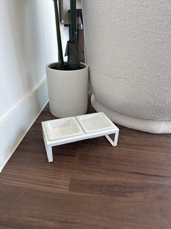 These bowls are perfect for our small dog. I like the look but more importantly I really appreciate the ease of lifting the metal frame to take both bowls easily to the counter for filling… no mess.