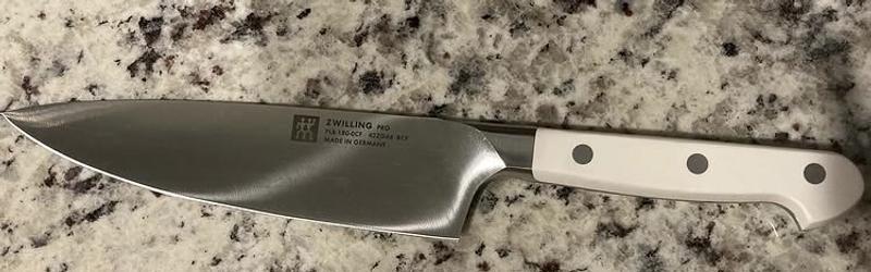 Beautiful, well-balanced knife with just the right amount of heft. Very ergonomic handle. It is my favorite kitchen knife.